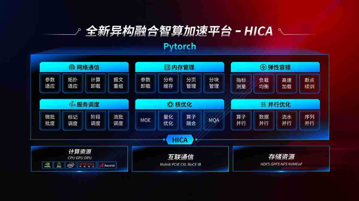 通过自研的服务层、、、中间适配层、、以及调度编排算法,,采用数据并行、、模型并行等多种并行方式,,,把并行计算任务进行有效的分解,,使其分别由相应的软件栈和算力资源来承接。。。当GPU资源变化,,,,HICA可以实时动态调度计算子任务并调整模型拓扑和架构,,,,以充分聚合各种算力资源。。。。