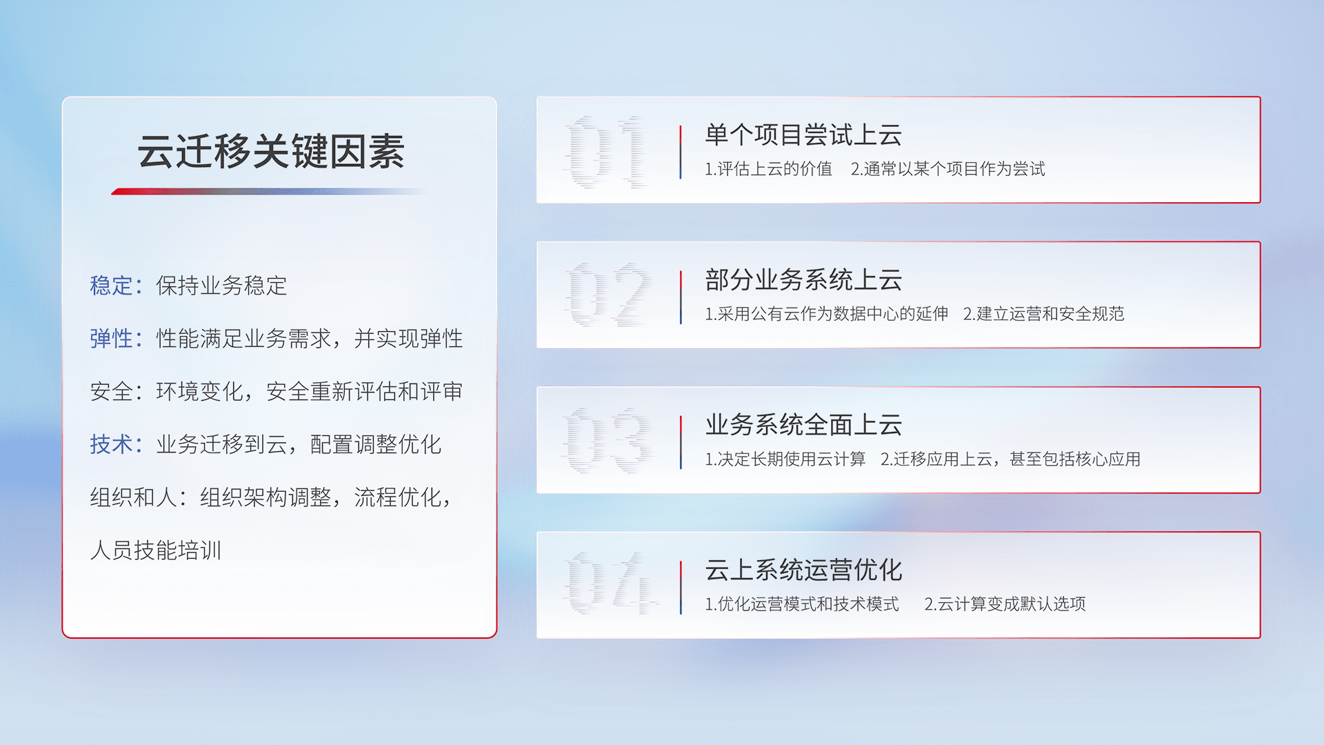 结合实际业务,,,,从规划设计、、云平台选型、、云原生改造、、、数据迁移、、、、集成交付,,,迁移全过程为客户识别最佳上云路径,,,,做好风险识别管理,,,设计网络架构、、、、身份权限、、安全审计合规、、操作审计、、、日志审计、、监控告警策略、、、多站点容灾设计等,,对云上基础设施进行整体规划,,,,提升IT治理水平,,,以满足弹性、、高可用、、、、高性能的需求。。。