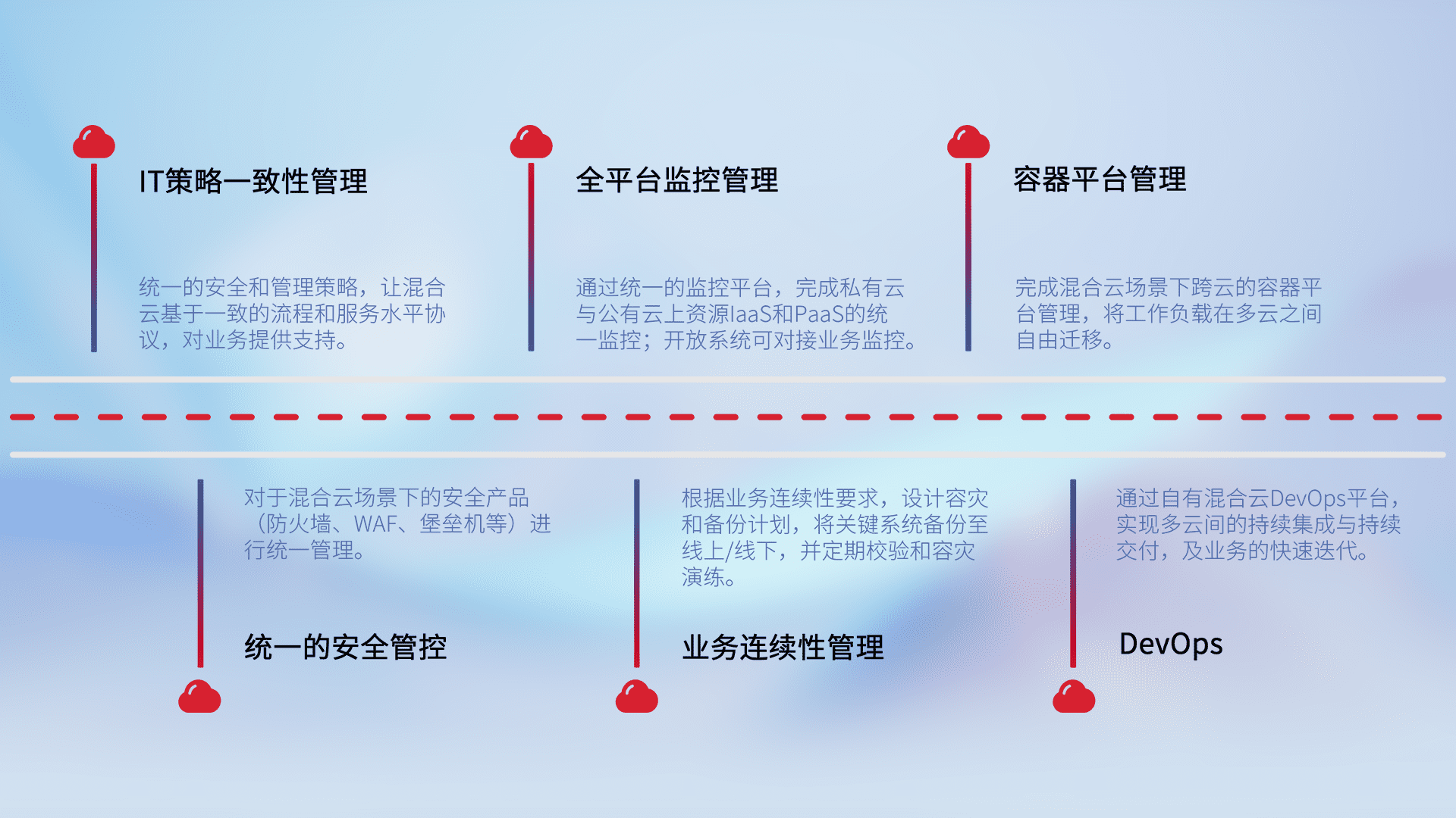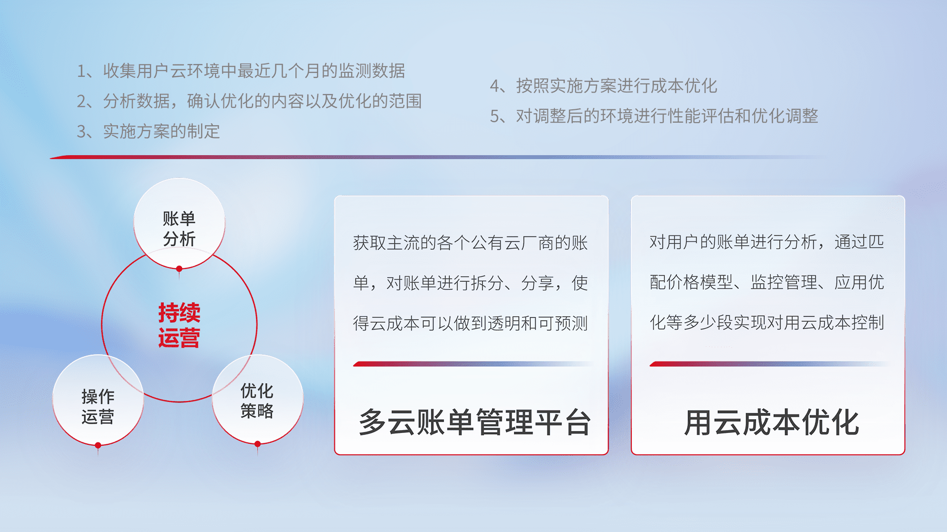通过多云纳管,,以统一的资源数据模型把客户的云资源进行抽象和封装,,进而实现对多云资源的统一操作,,保障云资源管理的可靠性、、、稳定性与可用性。。量身定制化运维内容,,,,配置、、、开发运维、、、、补丁管理、、、备份、、、监控、、认证和访问管理、、、审计和日常巡检等,,,保障在用云过程中的可靠度,,稳定度以及高可用率。。。。