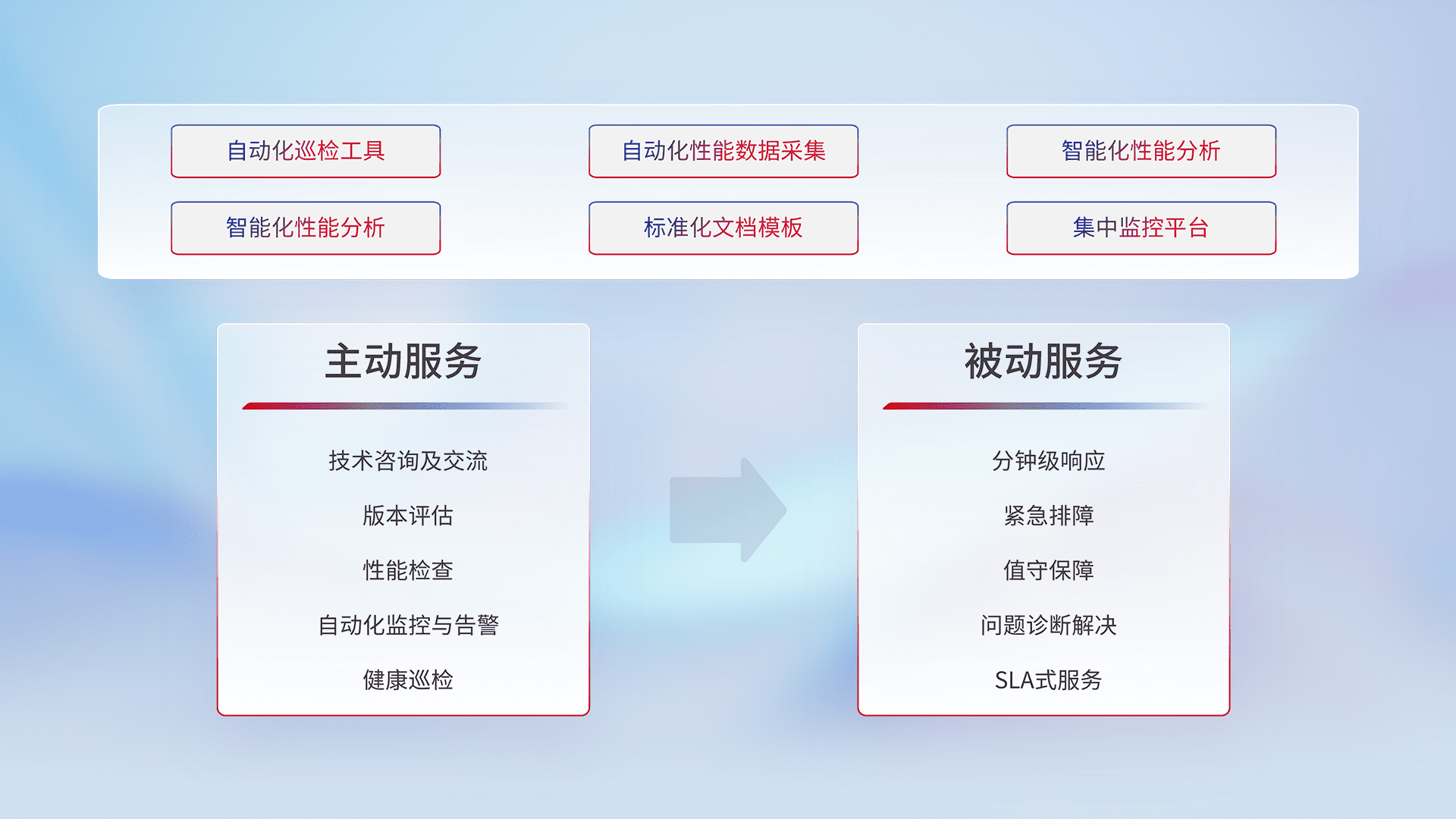 智能化工具和标准化文档,,,,保障服务质量,,,,提供主动服务(包含技术咨询、、、版本评估、、、性能检查、、自动化监控与告警、、、健康巡检)和被动服务包含(分钟级响应、、、紧急排障、、、、值守保障、、、、问题诊断解决、、SLA服务)。。。。