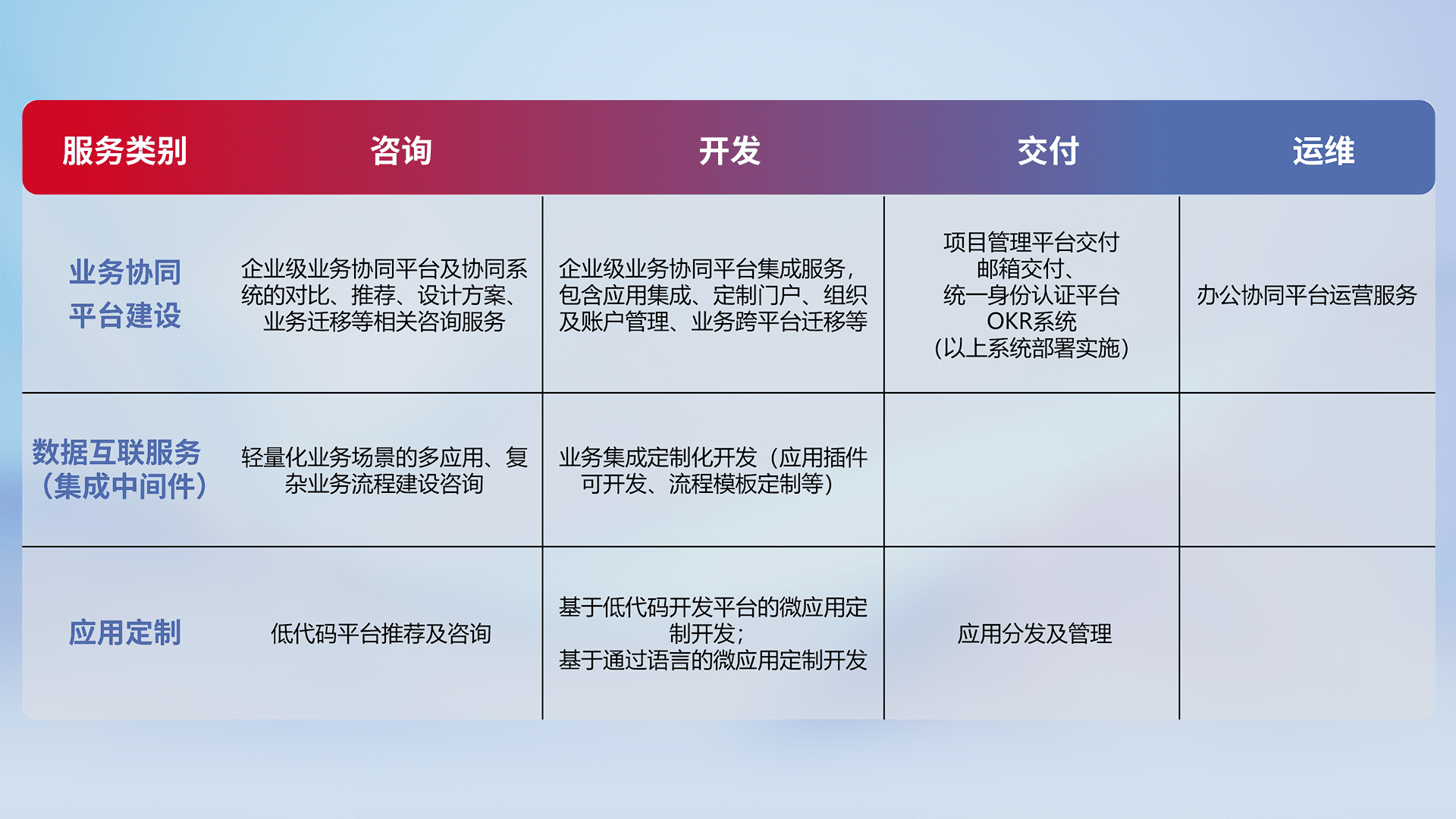 针对钉钉、、企微、、IDaas等平台级产品提供产品的规划、、方案、、交付、、、、定制化开发等服务,,,实现如统一协同办公、、、智能客户服务、、、、混合会议管理、、、智能数据查询、、、、等业务场景,,,实现数字化转型。。。